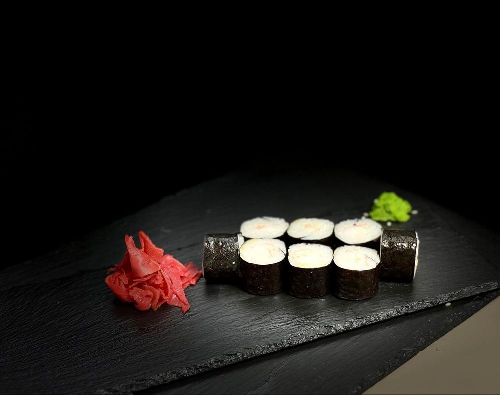 Состав: рис, нори, креветка, 30мл соевого соуса, 30мл имбиря, 5мл васаби