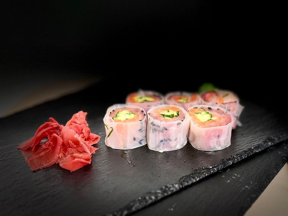 Состав: рисовая бумага, тунец, окунь, лосось, огурец, кунжут, 30мл соевого соуса, 30мл имбиря, 5мл васаби