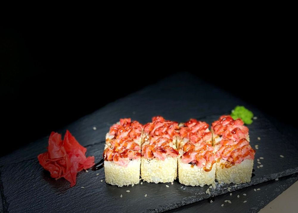 Состав: рис, нори, кунжут, сыр, лосось, огурец, смесь для запекания масаго, унаги, 30мл соевого соуса, 30мл имбиря, 5мл васаби