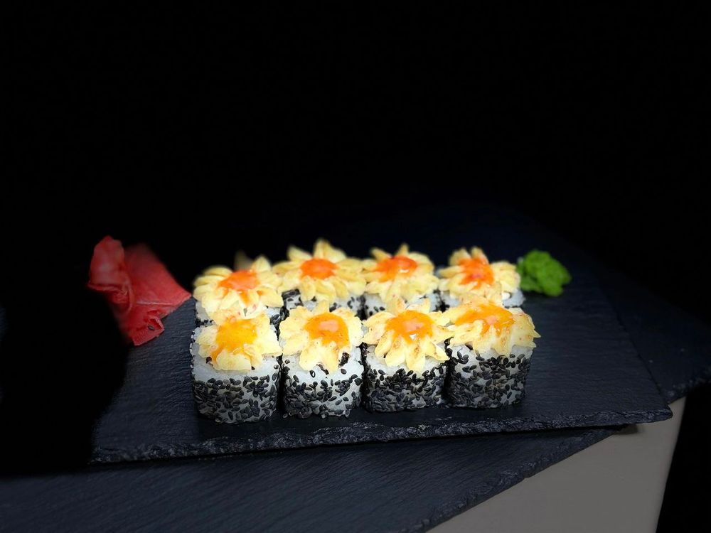 Состав: рис, нори, кунжут, сыр, окунь, томат, смесь для запекания снежный краб, сладкий чили, 30мл соевого соуса, 30мл имбиря, 5мл васаби