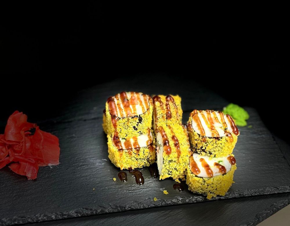Состав: рис, нори, сыр, креветка ,огурец, кляр, панировочные сухари, унаги, 30мл соевого соуса, 30мл имбиря, 5мл васаби