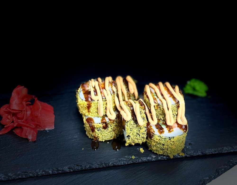 Состав: рис, нори, сыр, лосось, угорь, огурец, кляр, панировочные сухари, унаги, спайси, 30мл соевого соуса, 30мл имбиря, 5мл васаби