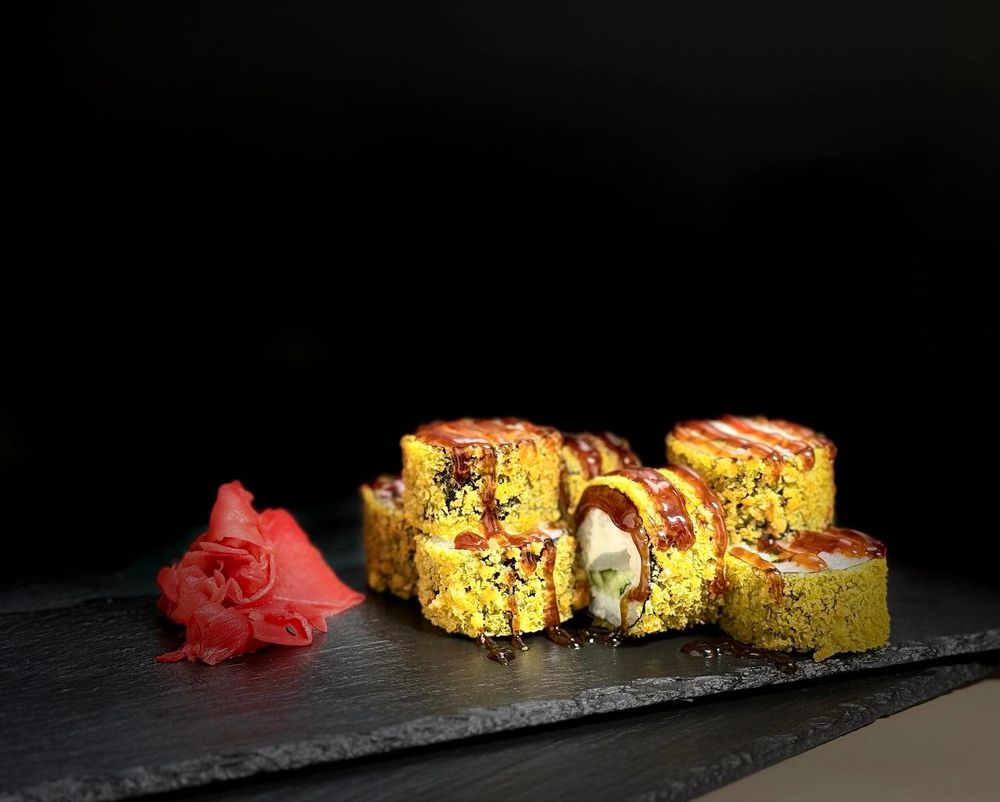 Состав: рис, нори, сыр, окунь, огурец, кляр, панировочные сухари, унаги, 30мл соевого соуса, 30мл имбиря, 5мл васаби