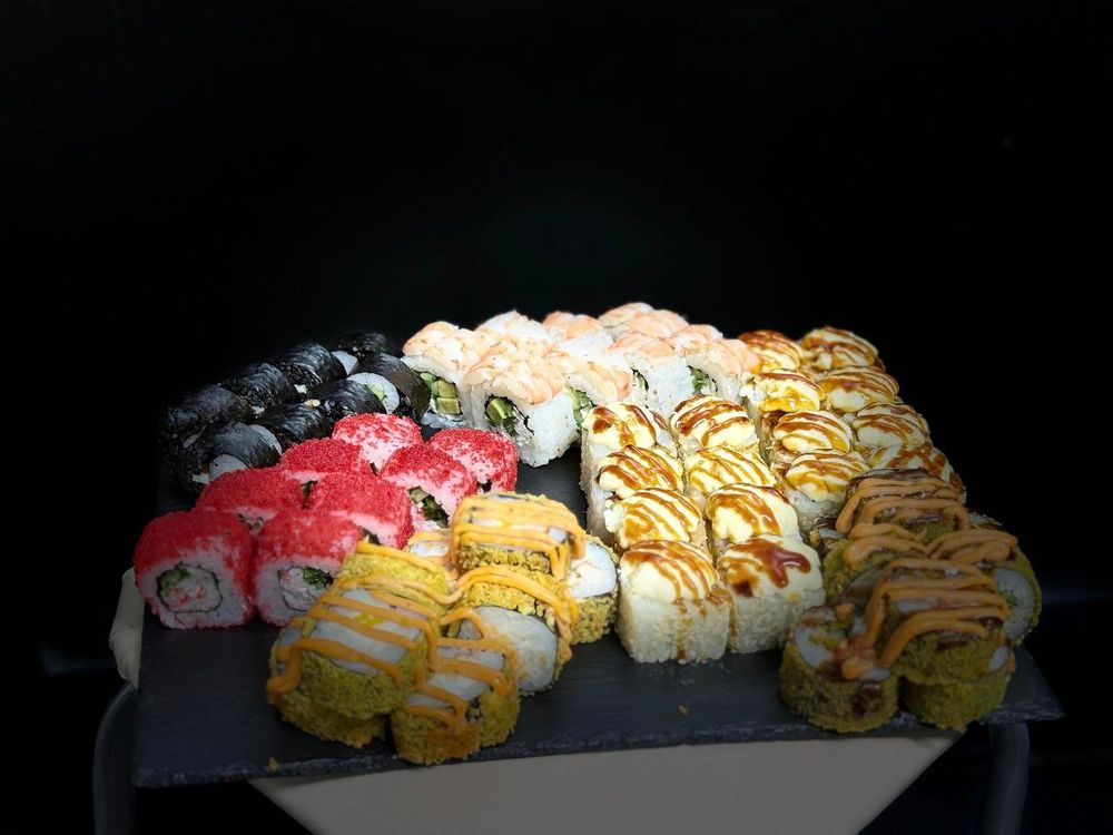 Ролл «Инь-янь», ролл «Калифорния классическая», «Эби» ролл, запеченный ролл «Массел хот», запеченный ролл «Унаги хот», «Чикен» темпура, «Тайко» темпураинь-янь, 30мл соевого соуса( 3шт), 30мл имбиря( 3шт), 5мл васаби( 3шт)