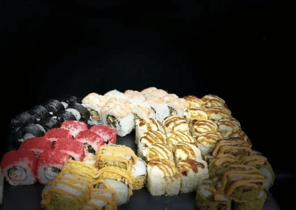Ролл «Мясной шарфик», ролл «Морской бисер с креветкой», «Дамский угодник», запеченный ролл «Мидийный», запеченный ролл «Скользкий тип», «Жареная цыпочка» , «Привет кревет» , 30мл соевого соуса( 3шт), 30мл имбиря( 3шт), 5мл васаби( 3шт)